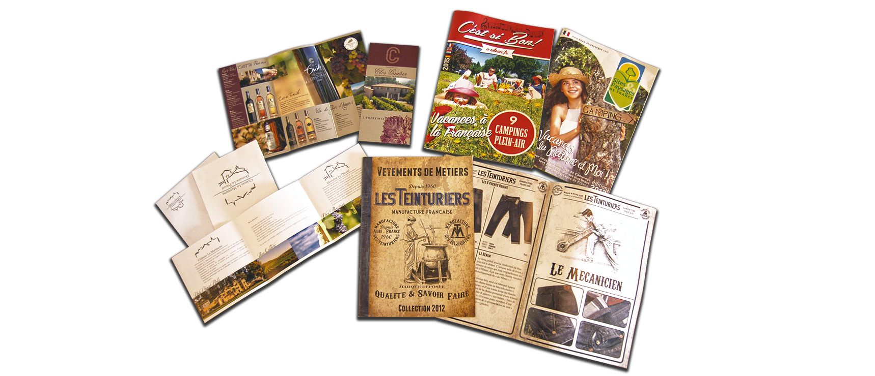 Des catalogues de vètements, de séjours touristiques , de campings… des plaquettes de présentation de domaines viticoles… Logos, charte graphique, mise en page et reportages photos réalisés par Biographix.